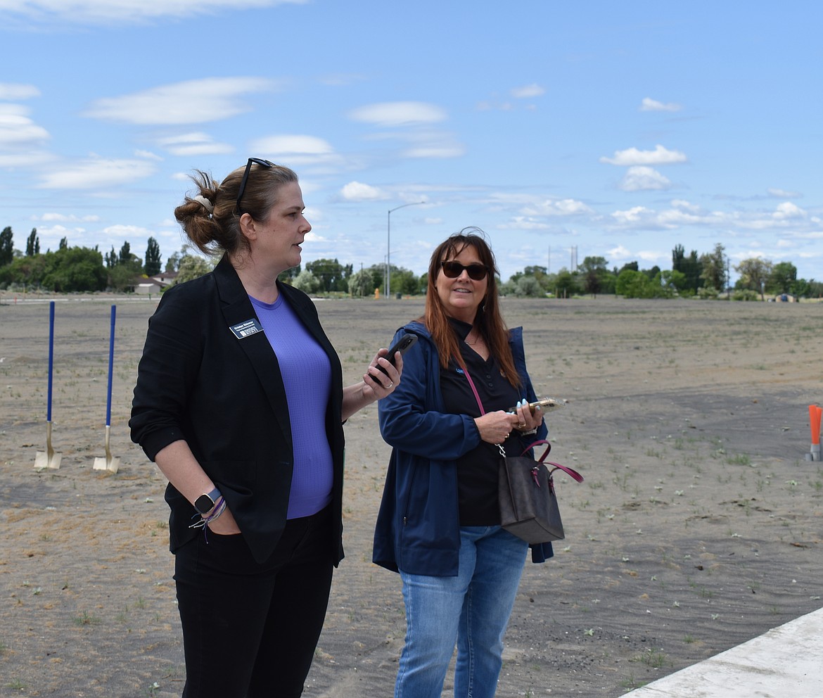 Hayden Homes Regional Marketing Specialist Kristen Skinner, left, talks with Moses Lake Chamber of Commerce Marketing Director Lori Robins at the groundbreaking for Sand Hill Place May 16. Sand Hill Place is Skinner’s first new community, she said, and she’s proud that she gets to start it off in Moses Lake.
