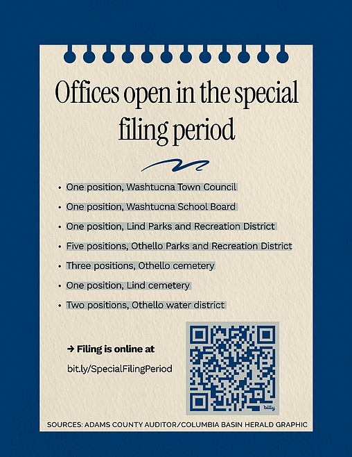 RITZVILLE — A three-day special filing period will be announced for Adams County elective offices that didn’t attract candidates during the filing week earlier in May. Elections administrator Jacque Laird said it was tentatively scheduled for July.