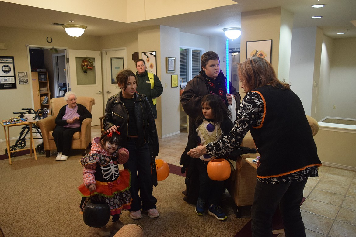 MOSES LAKE – Sandy, far right, hands out candy to Trick-or-Treaters Friday night. The group first visited Sandy and then went and visited Edna, far left. The Monroe House handed out candy to visitors from 6 p.m. to around 8 p.m. Friday night. Several residents dressed up and during peak hours, all sat outside of their doors handing out handfuls of sweet treats.