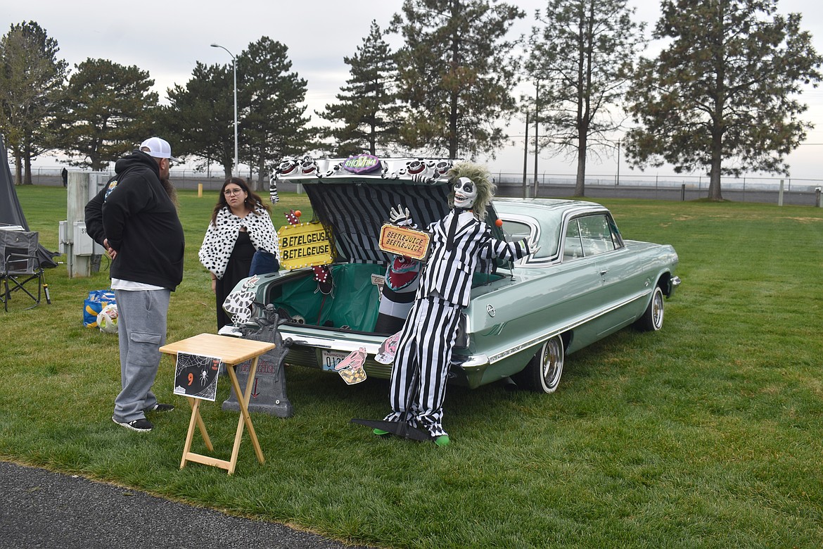 Ralph Gomez and his daughter Lindsey had decorated his 1963 Chevrolet Impala with memorabilia from the movie “Beetlejuice Beetlejuice,” with a stuffed mannequin of the title ghost, skulls and snakes and a sign that said “It’s show time.”