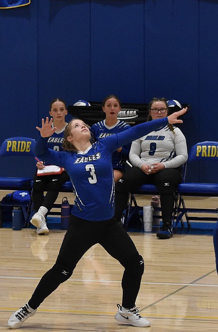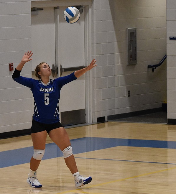 Devils junior Lila Sackmann gets ready to go for a kill during Wednesday’s matchup against the Eagles. The Devils are a very young team this year with the oldest players on the team being the five juniors and the rest being underclassmen. Moving forward head coach Shahan said she wants the team to be better prepared for any challenge that might come their way.