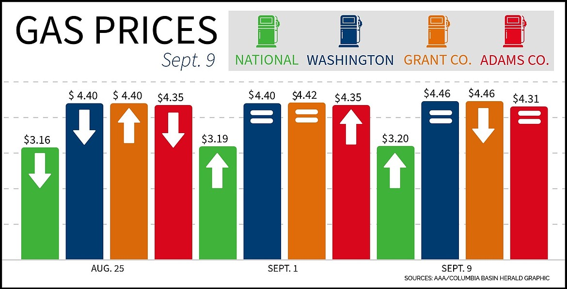 MOSES LAKE — There were slight increases to average gas prices in Grant County, Washington and nationwide this week, according to AAA. Adams County saw a slight decline in prices.