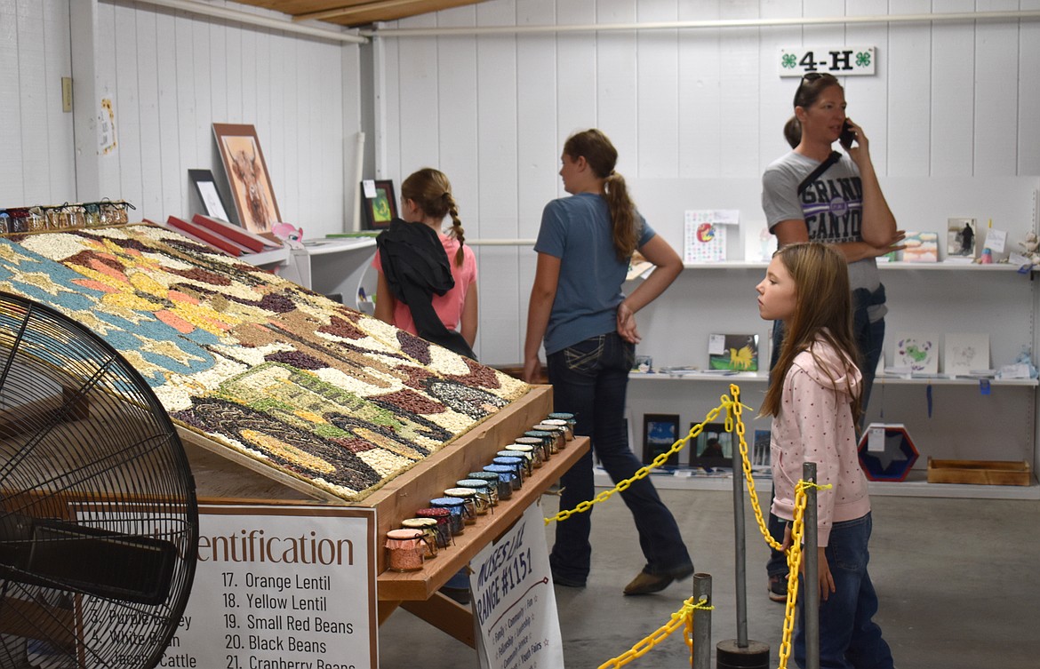 Lacy Roylance, 6, of Warden checks out a mosaic made of local crops in the Exhibitor Building at the Othello Fair.