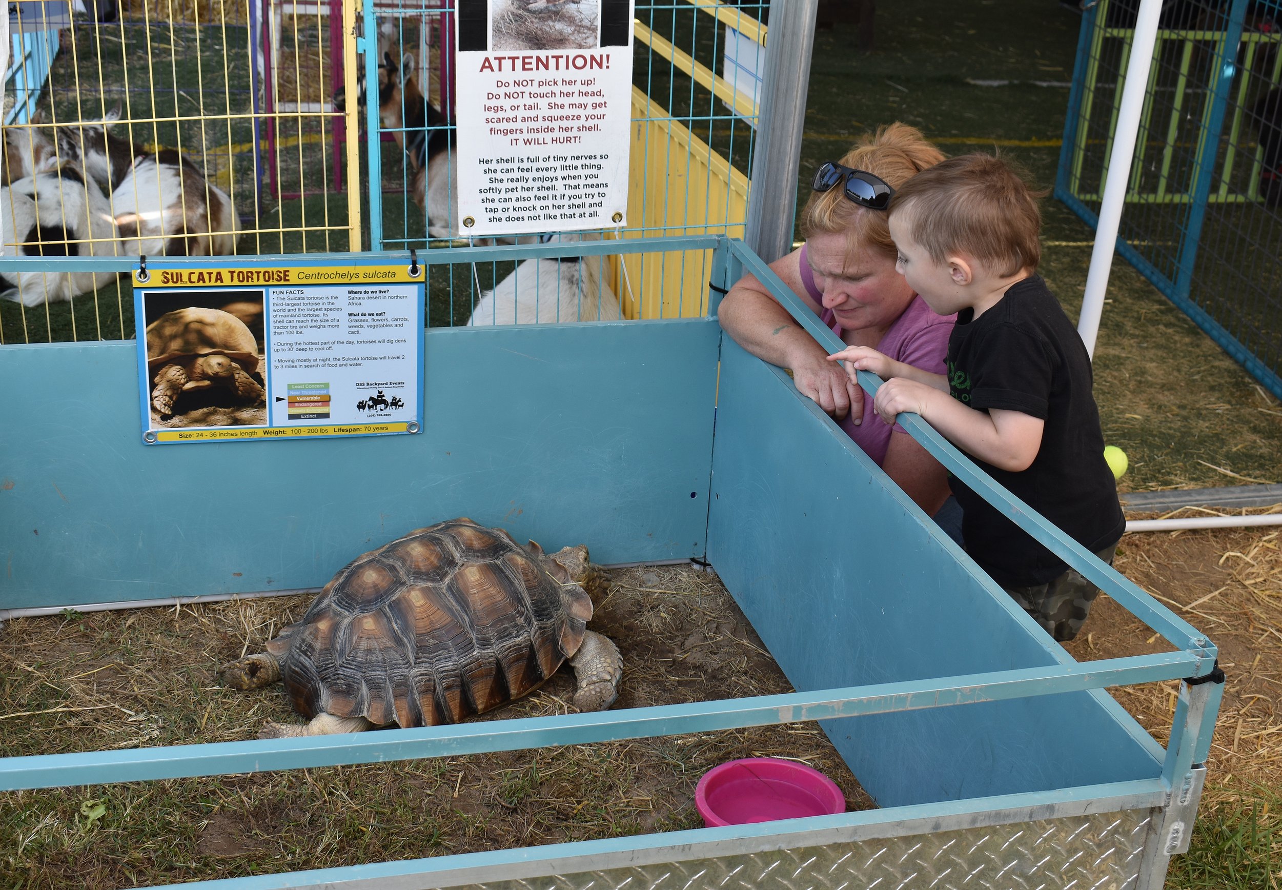 Four-year-old Rocky Downs, right, and his mom Marlys Downs of Ephrata get acquainted with Leslie the sulcata tortoise in the petting zoo at the Othello Fair Thursday.