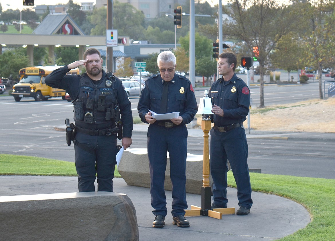 “We honor the lives lost on Sept. 11, 2001,” said Moses Lake Fire Department Battalion Chief Dave Holle at the memorial at Civic Center Park next to the Moses Lake Library. “On that day nearly 3,000 people died, including 343 (Fire Department of New York) firefighters, 23 New York Police Officers and 37 Port Authority Police Officers. Their sacrifice reminds us of the true meaning of duty, service and courage. Today we come together as firefighters, law enforcement officers and community members to remember them (and) to honor their families.”