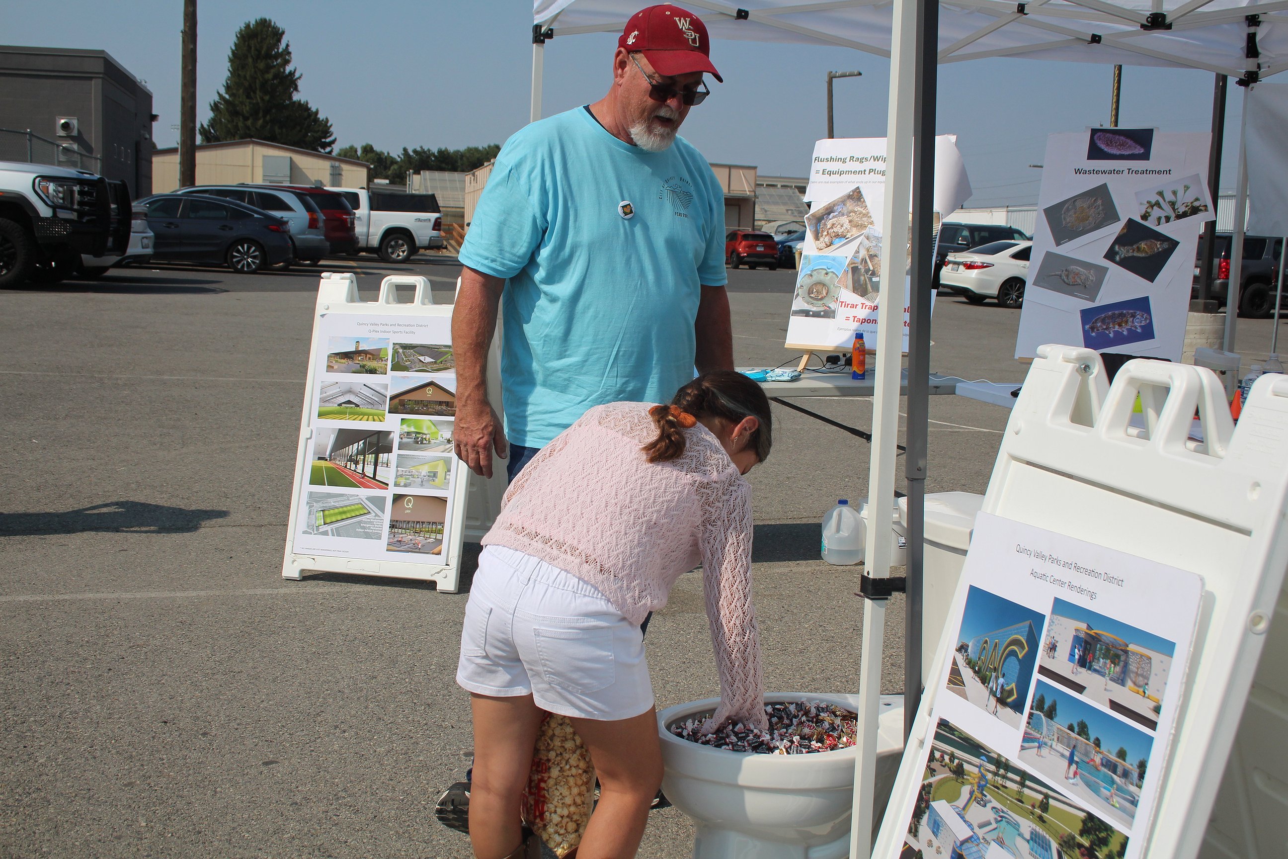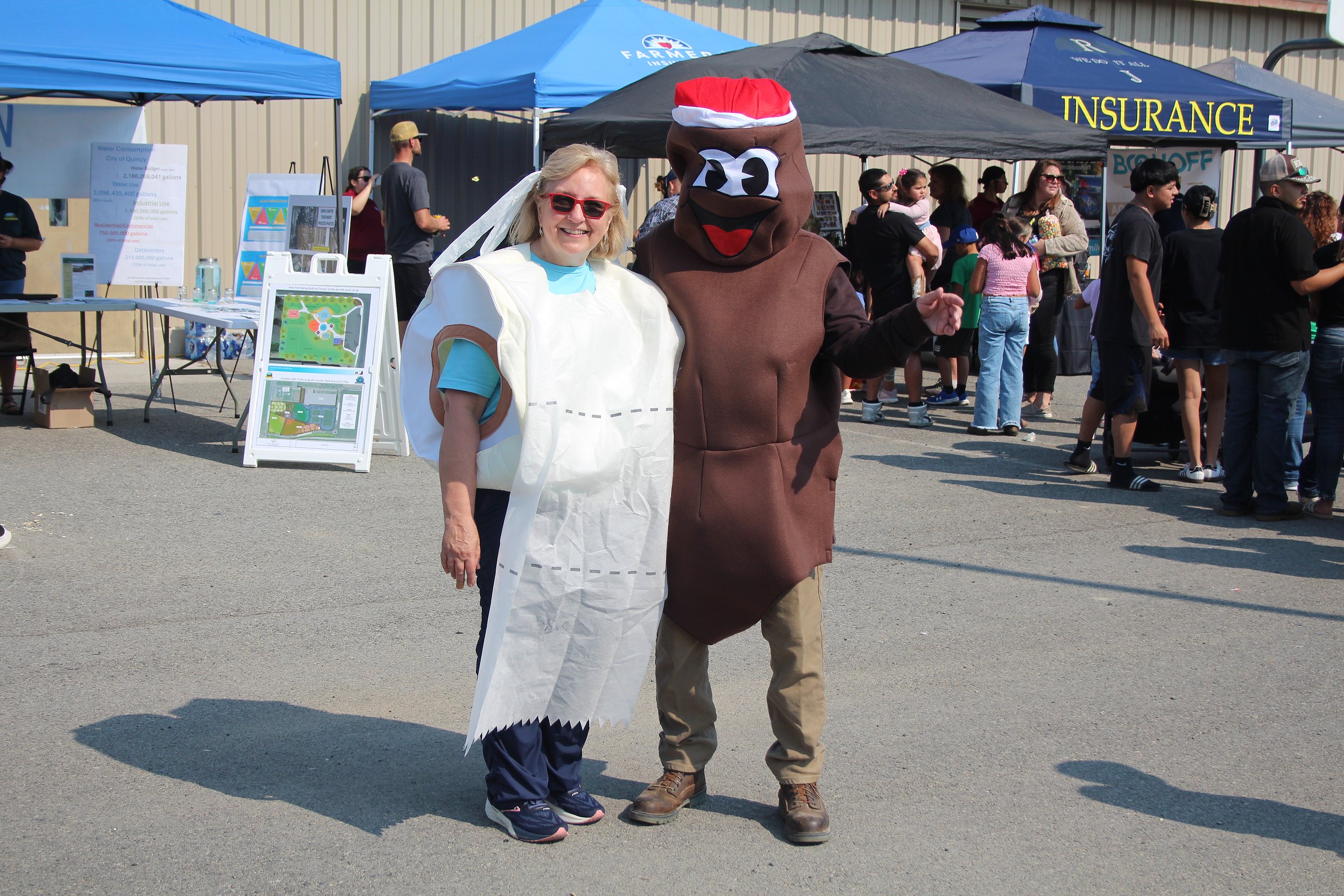 The QMS gym was bustling, and there were so many information and merchandise booths that they spilled onto the lawn behind the building. Quincy city officials are working on programs for water conservation and sewer system maintenance, and they promoted those with Water Quality Program Manager Bob Davis dressed as a pile of poo. His wife Paula came dressed as a roll of toilet paper.