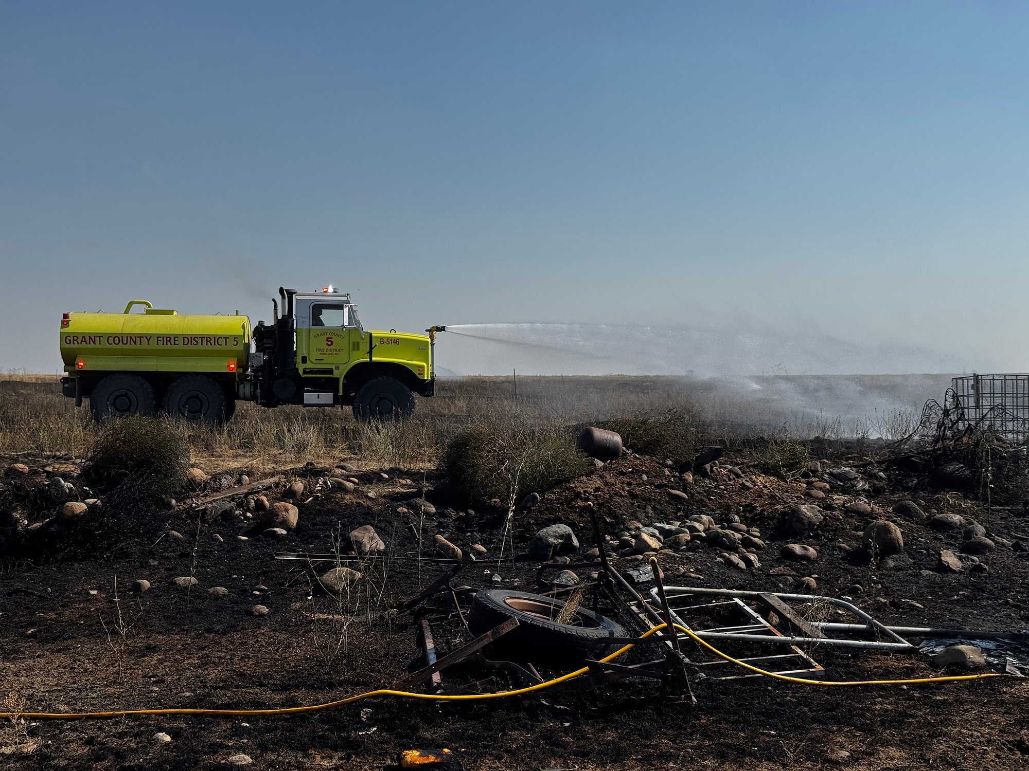 MOSES LAKE – Grant County Fire Districts 5 was called to a brush fire in the 5000 block of Highland Drive in rural Moses Lake at around 1:30 p.m. Thursday. Grant County Fire Districts 7 and 12 provided mutual aid.