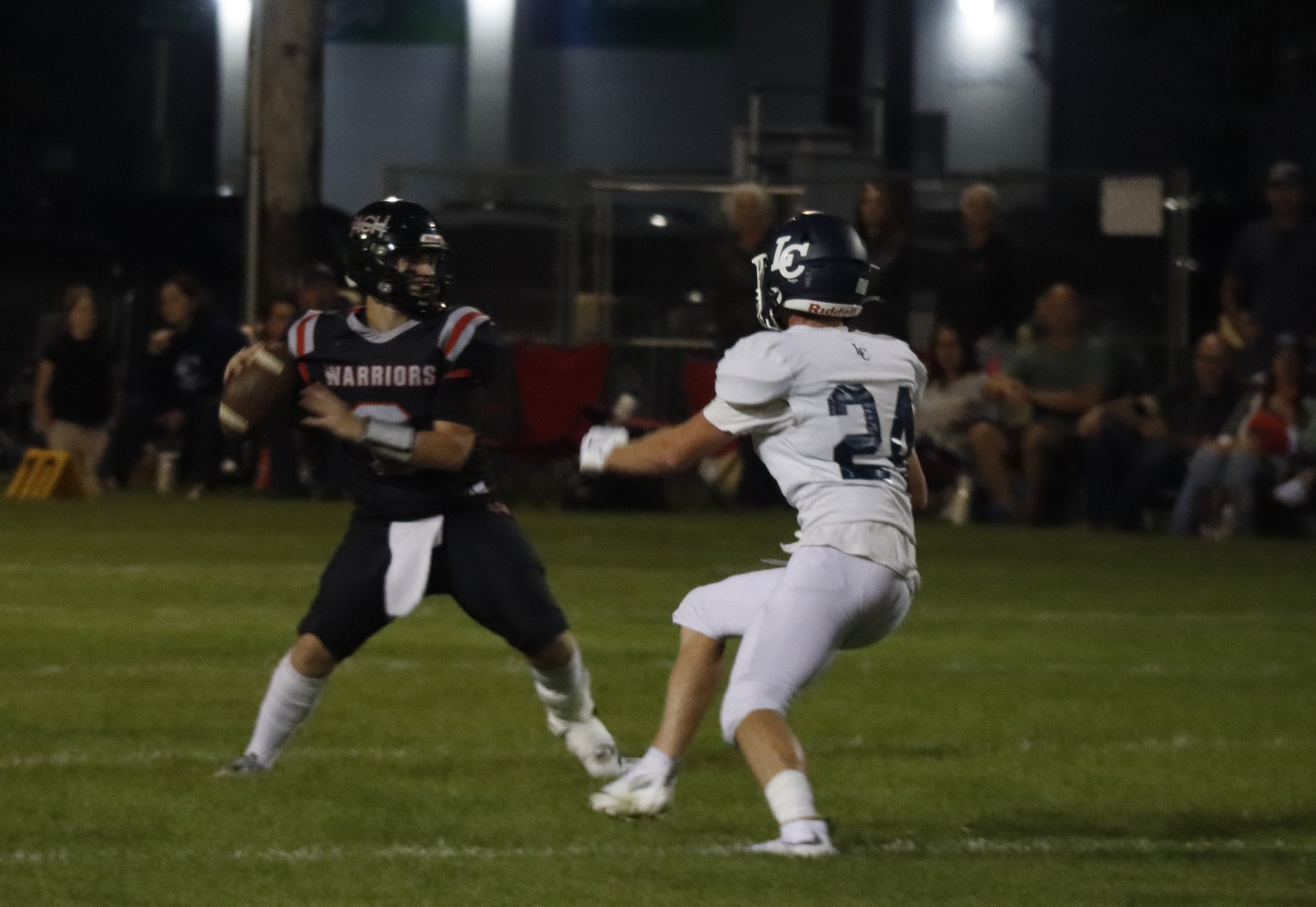 Through the start of the second quarter, the Warriors fell behind 14-0. However, they would respond on back-to-back offensive drives. Nolan and Max Grindy recorded short rushing touchdowns to cut the score to 14-12. With a minute left in the half, Liberty Christian found a way to score on a 45-yard passing touchdown to take a 22-12 lead at halftime.