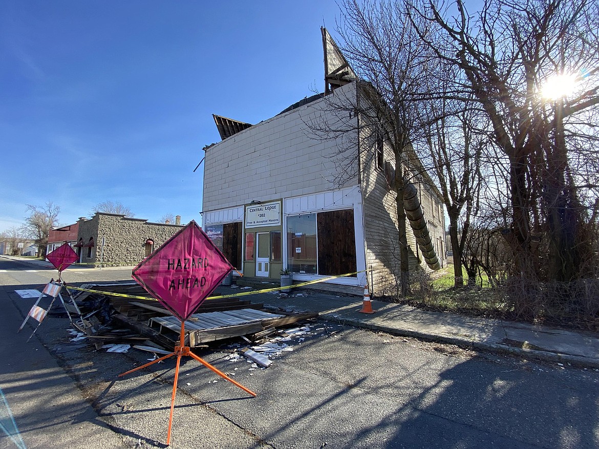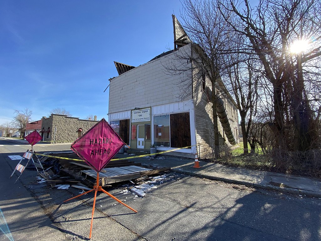 The upstairs also had served as a theater for movies and plays in the 1910s and ’20s, Plumb said. That was when the gable in the front 20 feet or so of the building was taken apart and replaced with a square structure with room to raise and lower a theater curtain. That construction was no match for a 2025 windstorm that caved in the rest of the roof and collapsed the false front.