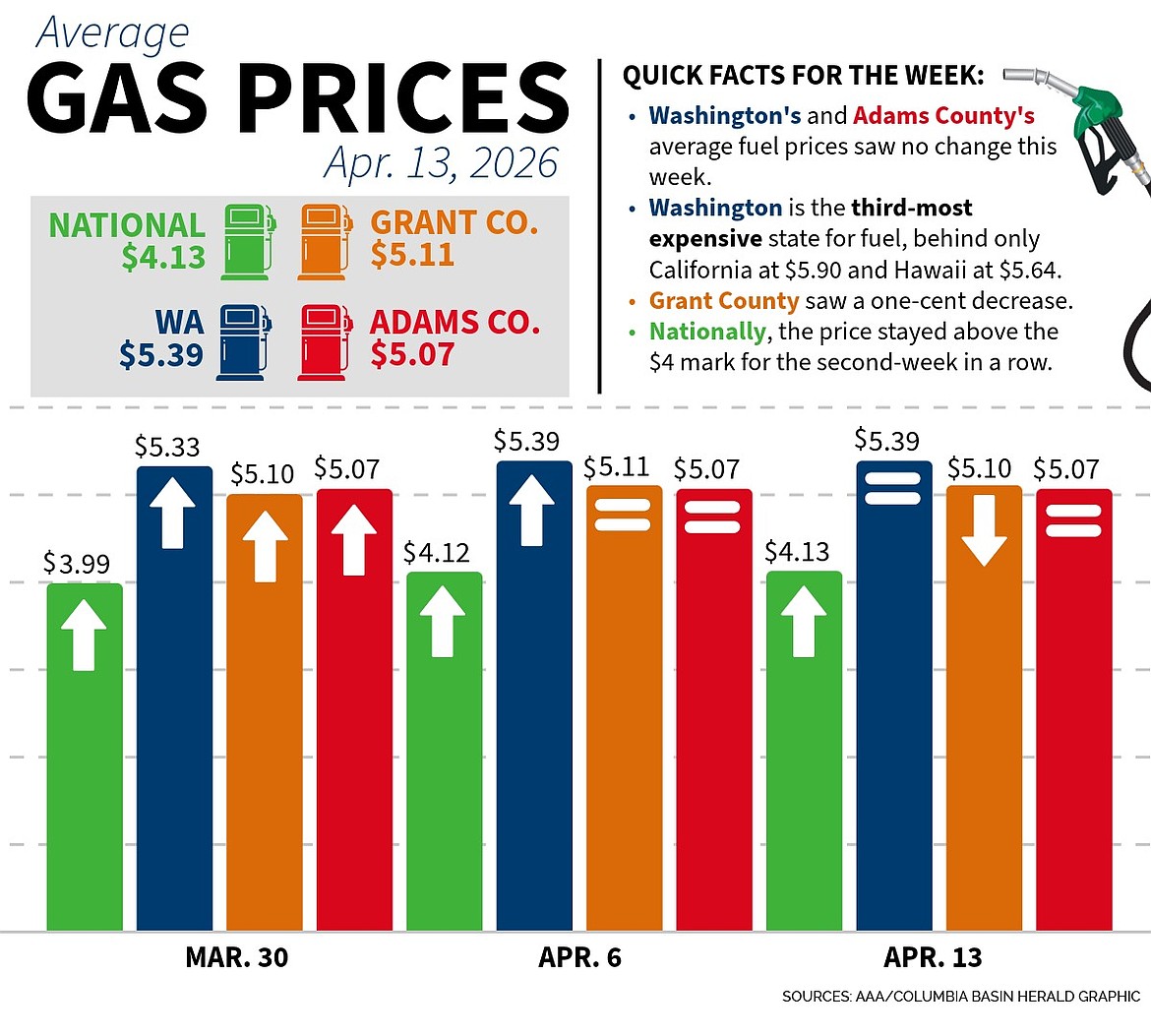 MOSES LAKE — Gas prices across Washington were largely unchanged this week, but drivers are still paying significantly more than they did in early January as global tensions continue to pressure oil markets.