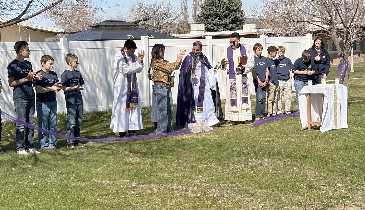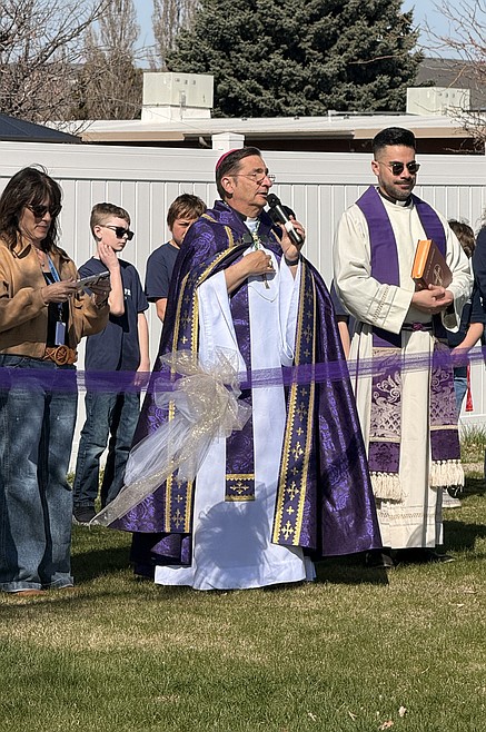 Bishop of Yakima Joseph Tyson came to Ephrata to preside over the groundbreaking March 27 in a field on the school grounds, with Fr. Cesar Izquierdo, pastor of St. Rose of Lima Parish, assisting. The garden will be planted with native plants, in a design created by the Columbia Basin Conservation District.