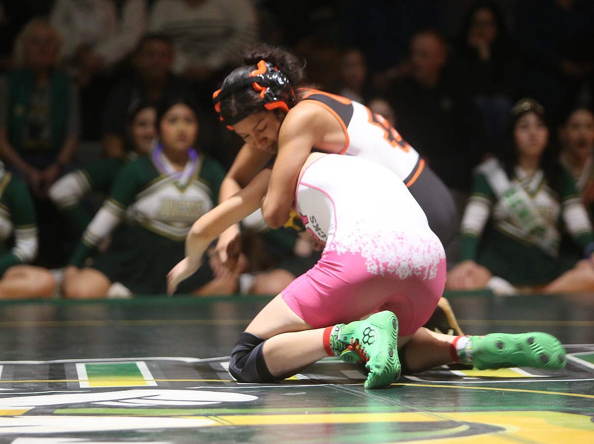 The Jacks took the lead first with five match wins. Four were pinfalls by Kimiko Kondo, Emiko Kondo, Crystal Perez and Klare Gans, and one forfeit to Brielle Baughman. Down 30-0, the Tigers began their comeback attempt with three-straight pinfall victories by Iris Downs, Alexandra Estrada Rangel and Addison Vasquez.
