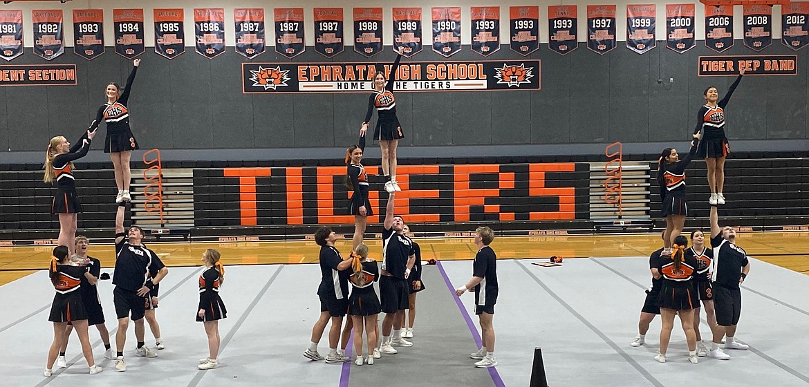 EPHRATA — The Ephrata Tigers cheer team traveled to Battle Ground High School over the weekend to compete in the 2A Cheer State Championships. The Tigers went on to take first in the 2A Game Day Co-ed competition with a final score of 87.9.