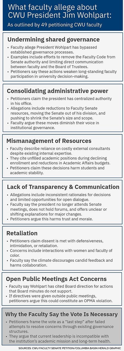 The 49 faculty petitioners initiated their no‑confidence petition Jan. 20 and submitted it to the Faculty Senate along with extensive documentation alleging that Wohlpart has undermined shared governance, consolidated administrative authority, reduced faculty roles in decision‑making and budgeting, and may have contributed to actions that violated the state’s Open Public Meetings Act.