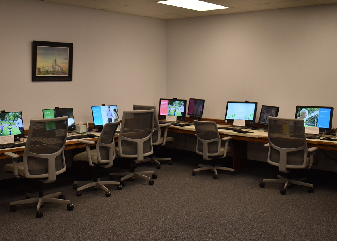 The center is tucked away in a corner of the Moses Lake East Stake Center on Division Street. Anyone who wants to, church member or not, is welcome to let themselves in a back door and step down a little hall to a quiet room with 14 computer terminals arrayed at neat desks. There they can sit down at a terminal and immediately access an unimaginable world of information for absolutely no cost.