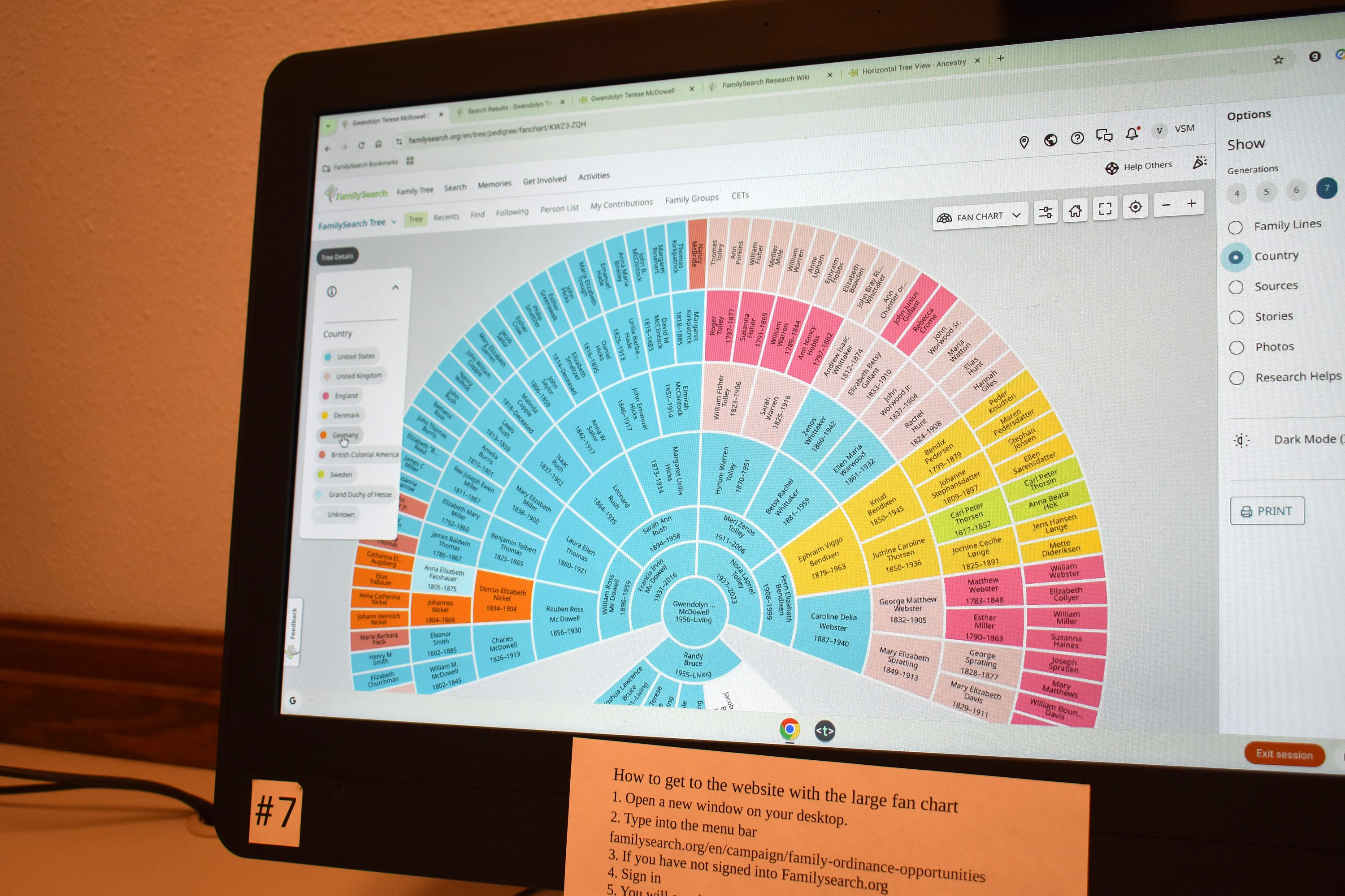 Once a user begins creating their family tree, they can view it several different ways, horizontally or vertically, starting from the user themselves or sowing descent from a single ancestor. But there’s another, visually striking way to show the family called a fan chart, which begins with the user and shows their ancestors fanning out like a peacock tail. The names emanating out for generations and centuries, sometimes from all over the world, show how many people it took to arrive at one individual.