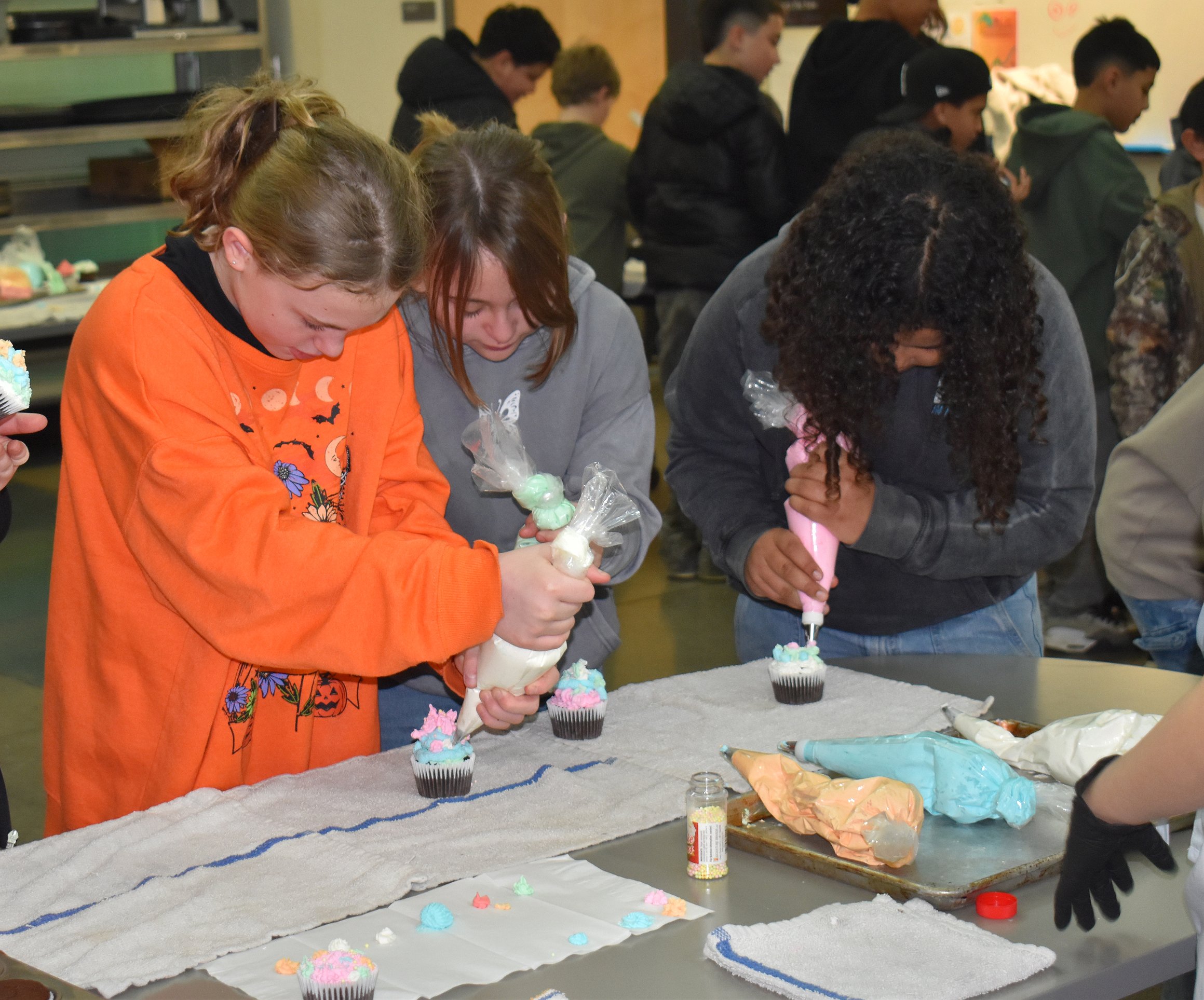 The potato projectiles may have been popular, but they were only part of what was going on. The young students went from one station to the next escorted by CBTECH students in potato costumes, checking out the medical assistant and certified nursing assistant programs, where they learned to do CPR and how to don and remove sterile gloves without contamination, something medical professionals must do frequently. They also stopped off at kitchen, where culinary students served up fresh-made french fries with sauces made from scratch and helped them ice cupcakes. Culinary Instructor Nathan Bathurst gave the visitors some insight into the flavors they were experiencing.