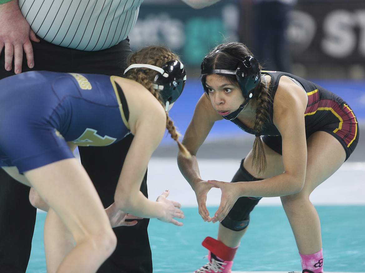 Elyssa Armendariz, right, gets set for her second match against an opponent from Mead. Armendariz was victorious 16-0 via technical fall.