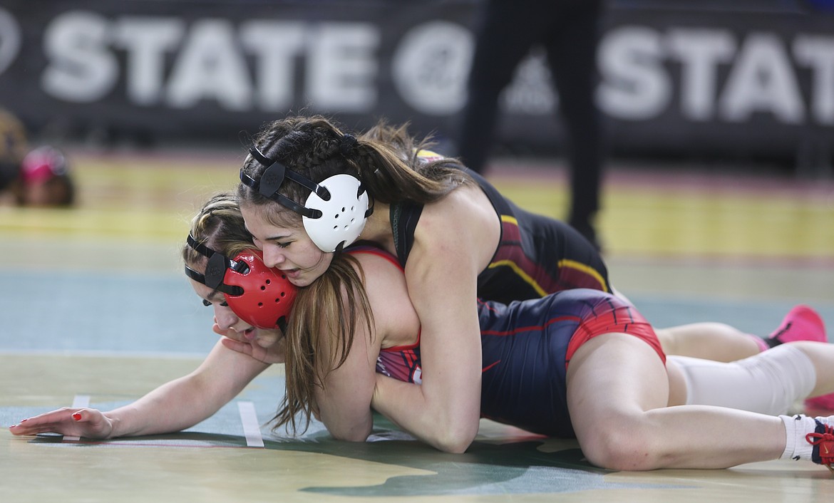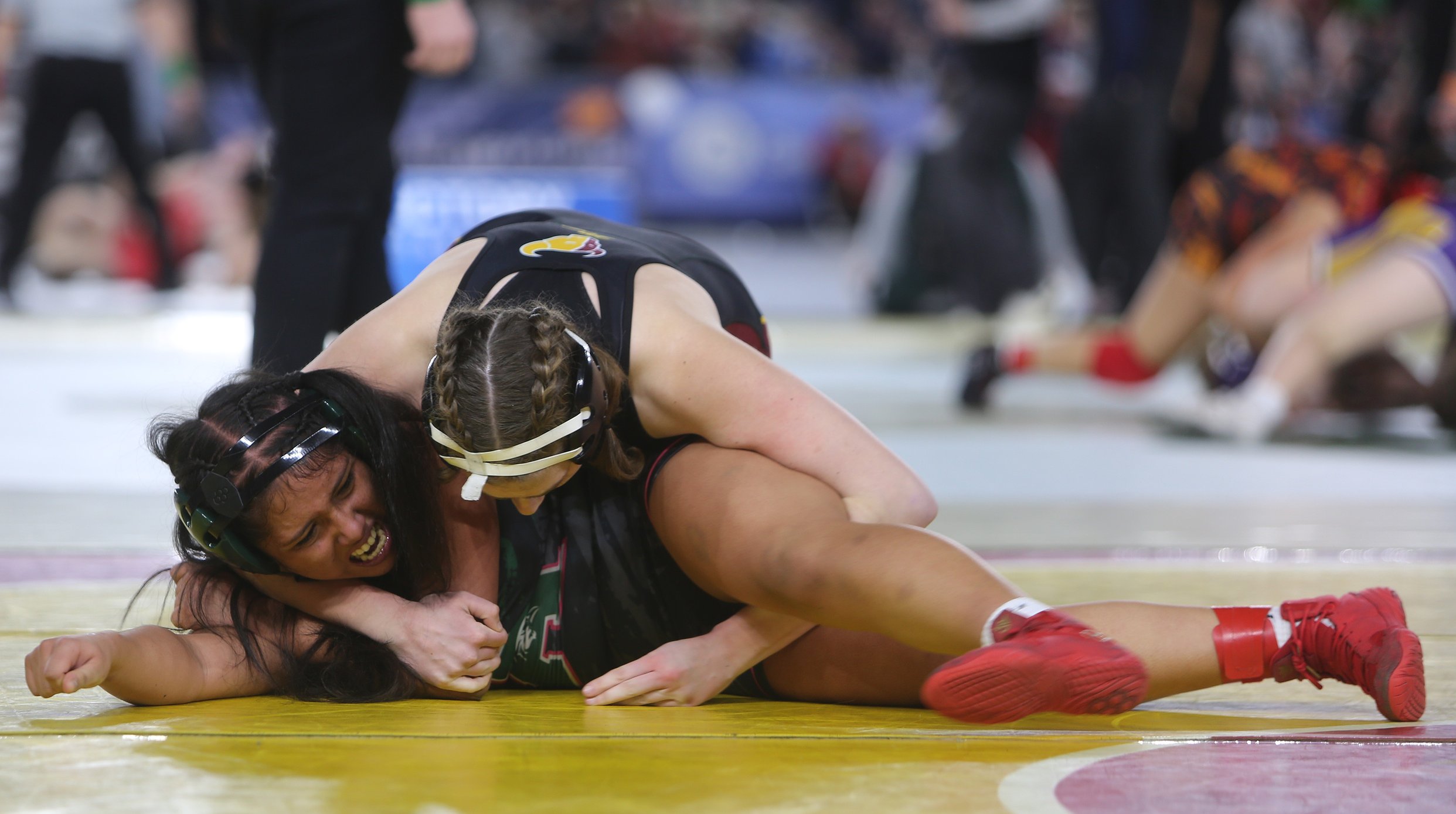 The Mavericks’ Emma Thompson, top, tries to wrap her opponent in a cradle for a pinfall attempt at the Mat Classic Thursday.