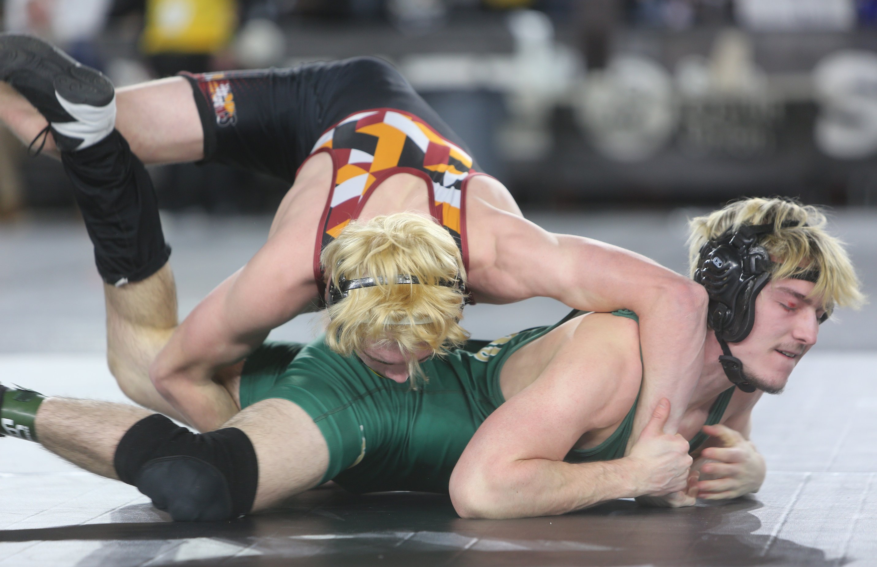 Ian Anderson, in maroon and yellow, controls his opponent on the mat. Anderson won his first match 17-1 via technical fall at the Mat Classic Thursday.