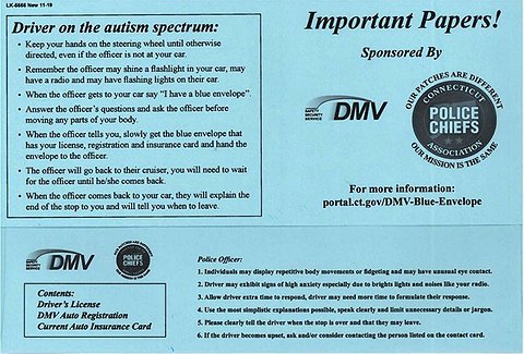 The program is modeled after one created in Connecticut in 2020 and since adopted by several other states. A driver with a neurodivergent condition like autism requests a special blue envelope from the Department of Licensing, in which the person keeps their vehicle registration, insurance papers and other papers a police officer might ask to see. The envelope would be printed with instructions for the officer as to how to communicate effectively with the driver, as well as reminders for the driver as to how to respond when pulled over.