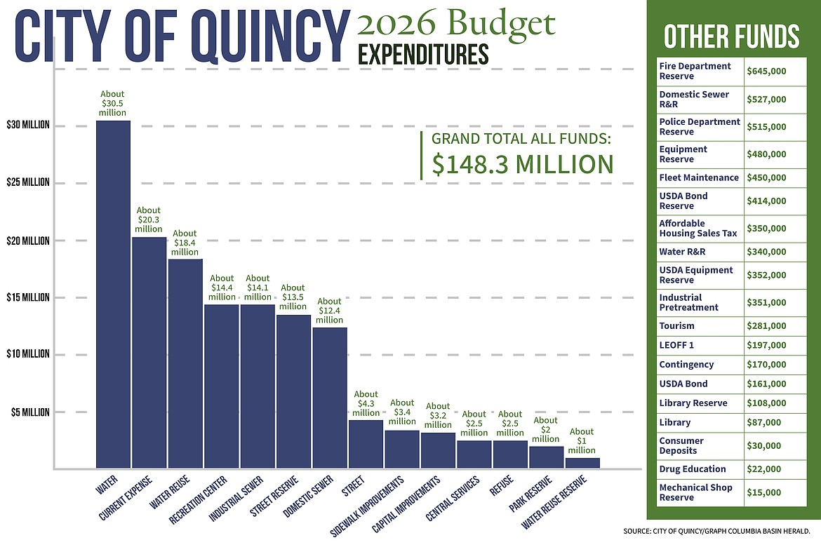 QUINCY — The city of Quincy will operate on a budget of about $148.3 million for 2026. That includes money for street projects along 13th Avenue Southwest and M Street Northeast, the design and construction of a fieldhouse and other improvements in Lauzier Park and funding through sales tax for affordable housing assistance.