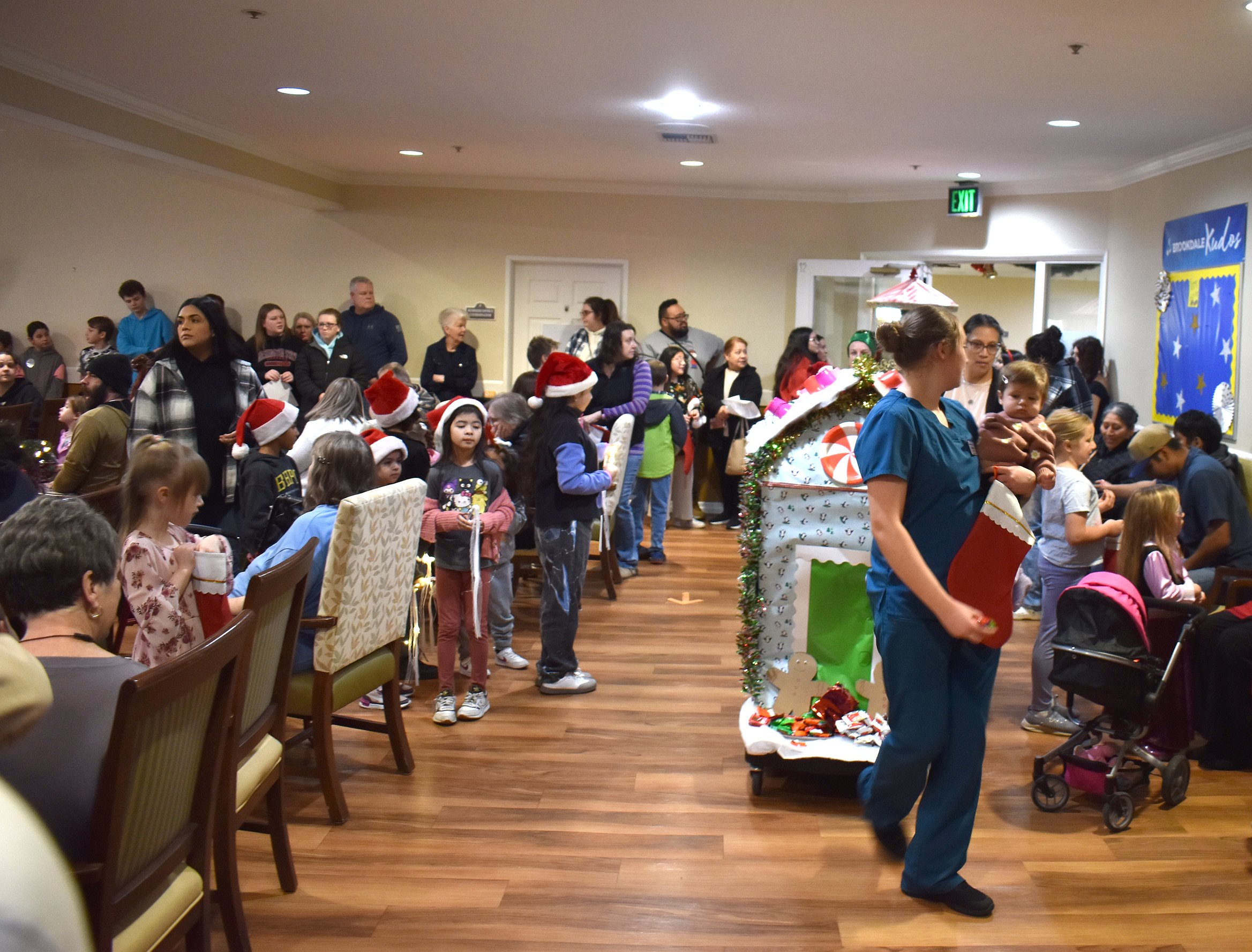 Santa and Mrs. Claus led a parade of small floats through the halls of Brookdale Hearthstone into the dining room. The floats were made by residents and staff, and included cleverly-constructed gingerbread houses, a sleigh and Santa’s workshop. The Clauses settled into chairs with a sign reading “North Pole” and waved as the floats, staff and children filed through.