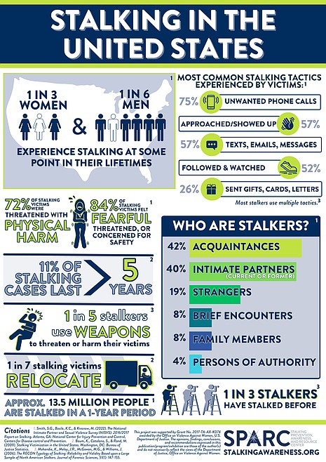 The month is meant to draw attention to an especially dangerous form of abuse. One out of three women in the U.S. will experience stalking at some point in their lives, according to statistics from the Stalking Prevention, Awareness, & Resource Center, and one in six men. More than a third of stalking cases involve a current or former intimate partner.