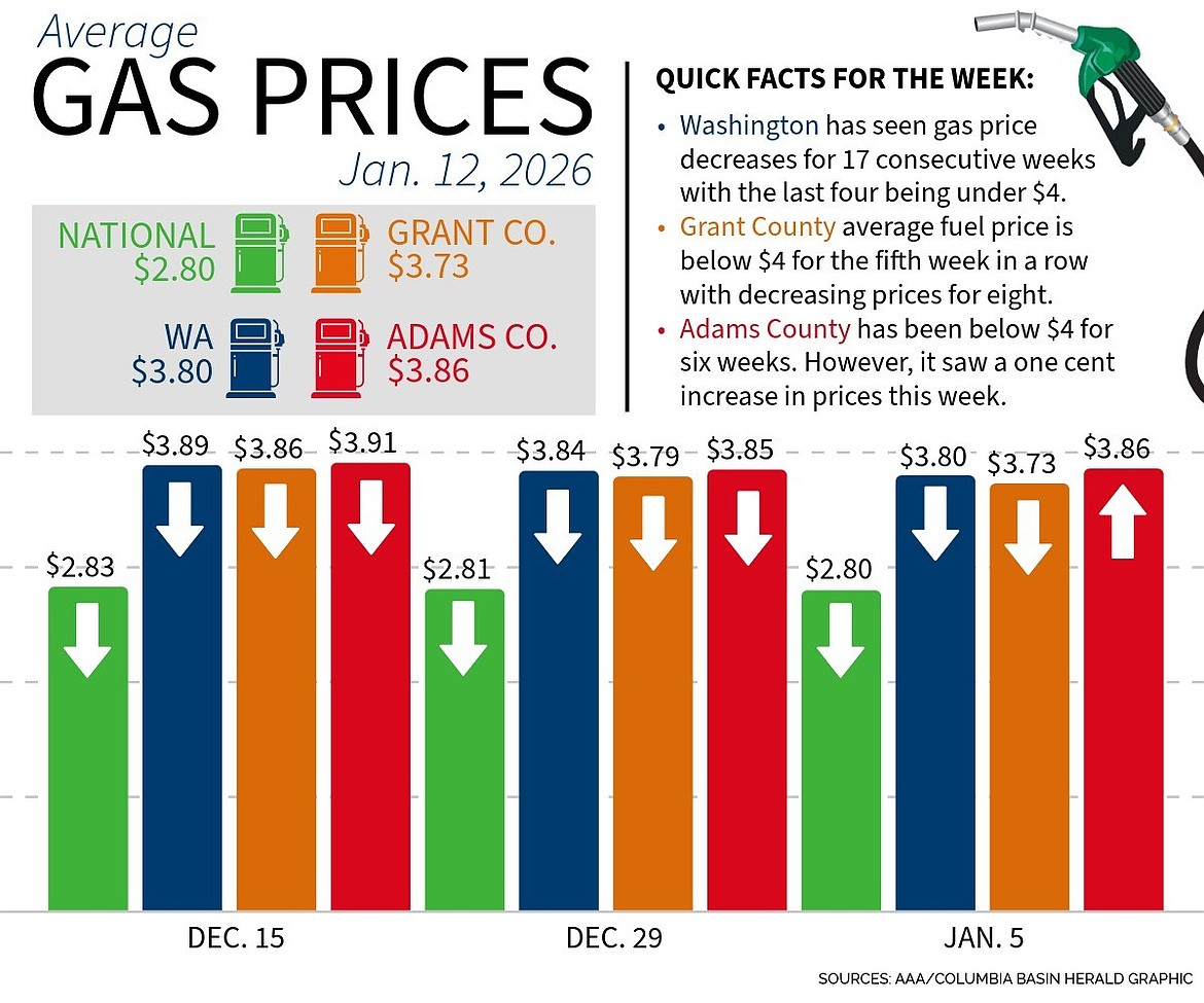 MOSES LAKE — Gas prices decreased nationally, in Washington state and in Grant County. However, Adams County saw a slight increase of one cent this week.