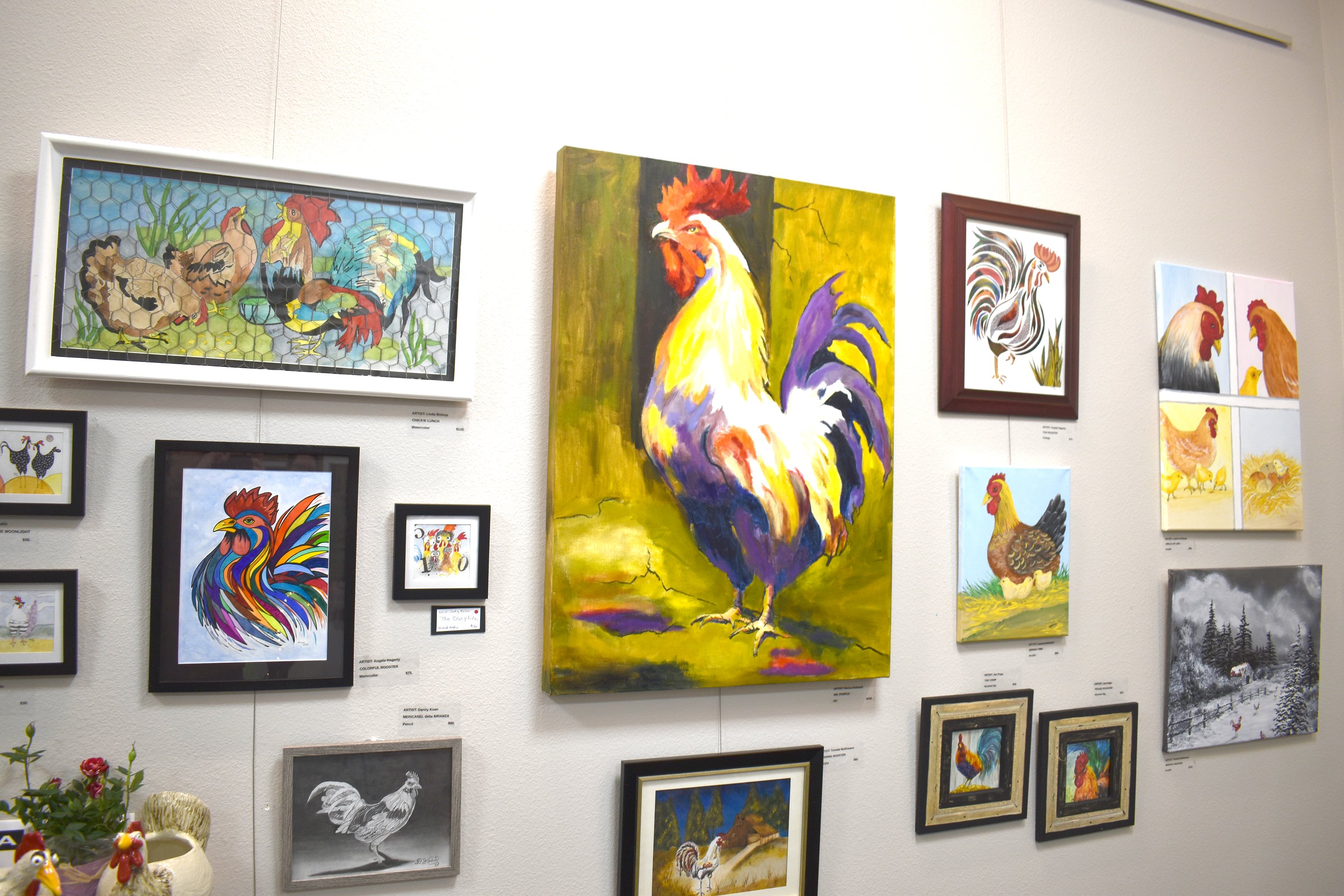 MOSES LAKE — A whole flock of artists contributed to The Chicken Show at Up Town Gallery in Moses Lake on Friday.