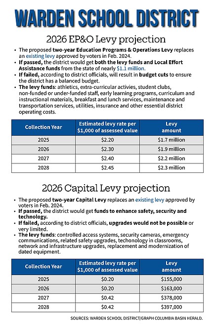 WARDEN — The Warden School District has proposed two levies to the community for the Feb. 10 election. The Educational Programs and Operations Levy and the Capital Levy for safety, security and instructional technology improvements are both designed to support the district's ongoing operational needs and infrastructure improvements. Superintendent Marc Brouillet said both levies are important in maintaining educational standards and student safety.
