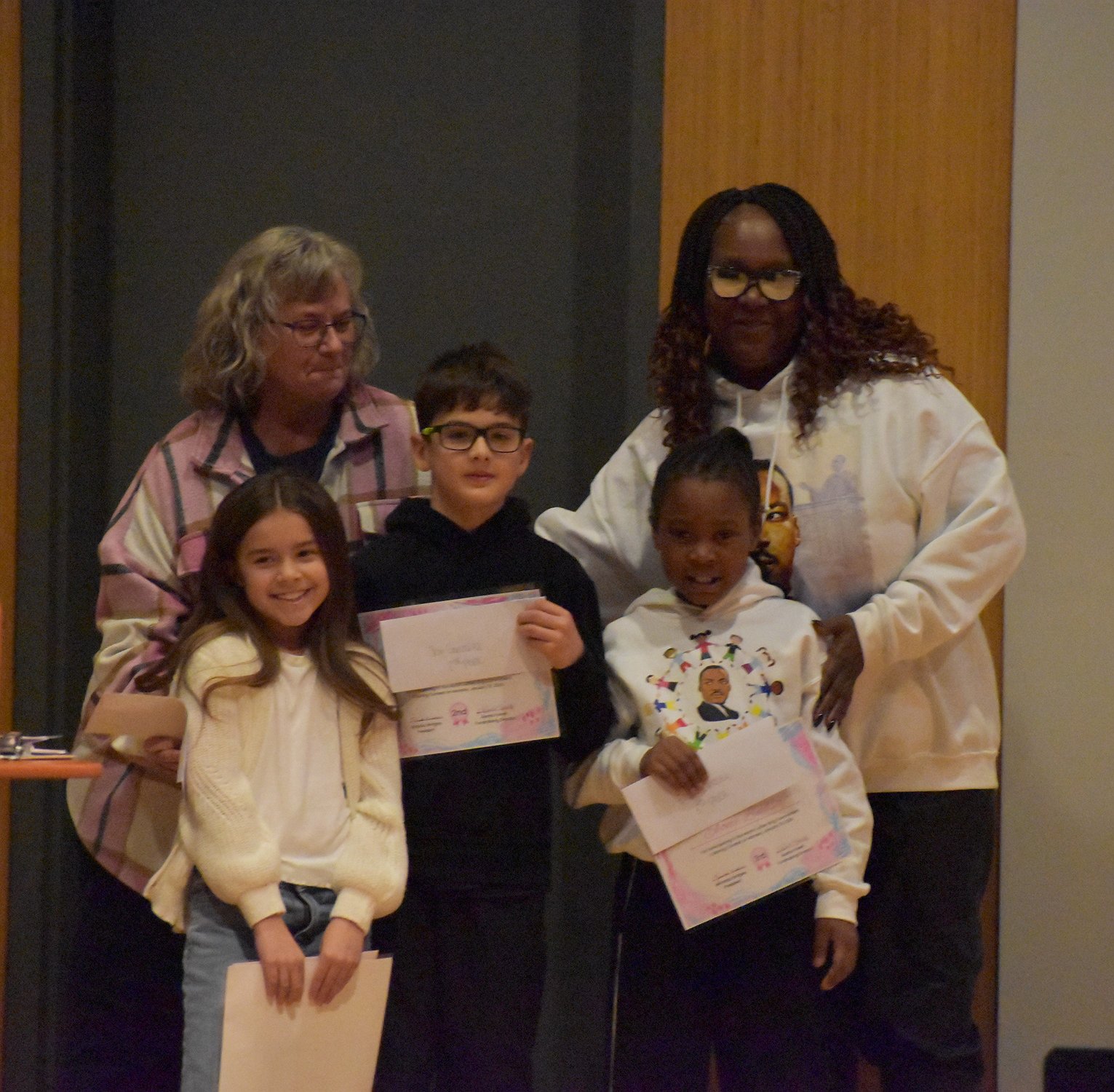 Groff Elementary third-grade teacher Regina Doremus with coloring contest winners Eveah Marque, first, Jax Gonzalez, second, and Eboni Lindsey, third, and Moses Lake Martin Luther King Committee President Miranda Bridges stand together on stage. The whole class was awarded a pizza party for its hard work in the competition.