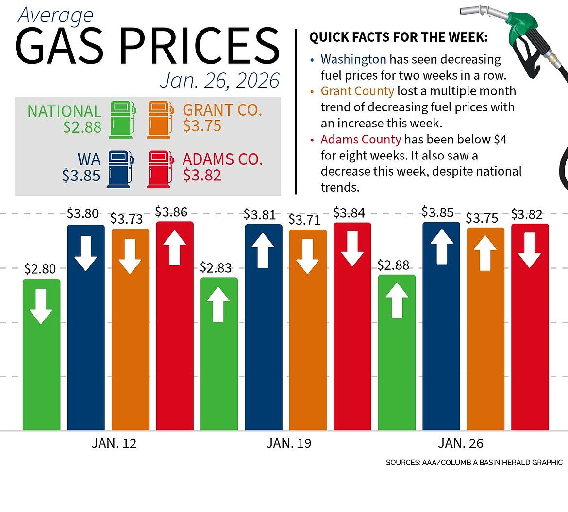 MOSES LAKE — For the second week in a row, both national and Washington fuel prices increased, and Grant County’s 14‑week streak of falling gas prices came to an end with a four‑cent climb. Adams County did not follow the national trend and instead saw a slight two‑cent decrease.