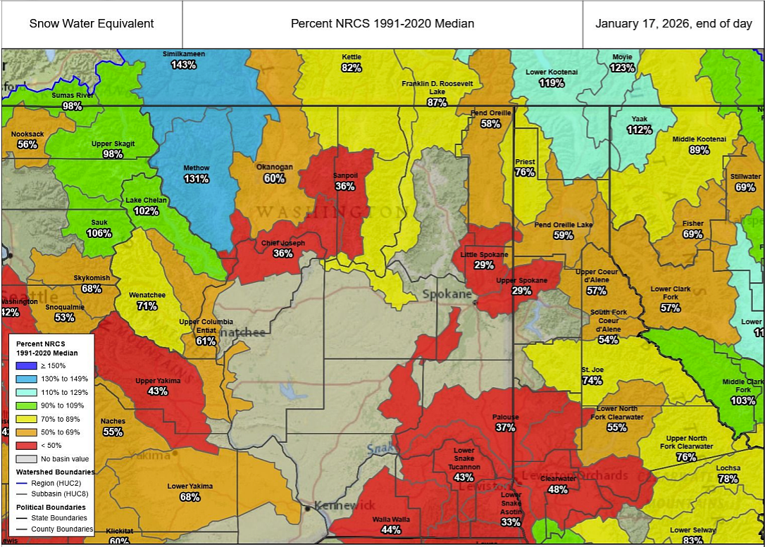 But at lower elevations in Okanogan County, running from Pateros north to Omak, the snow water equivalent is at 36% of normal. The area that feeds Lake Roosevelt is at 87% of normal, according to the NWS, but the Yakima River basin ranges from 68% to 43% of normal.
