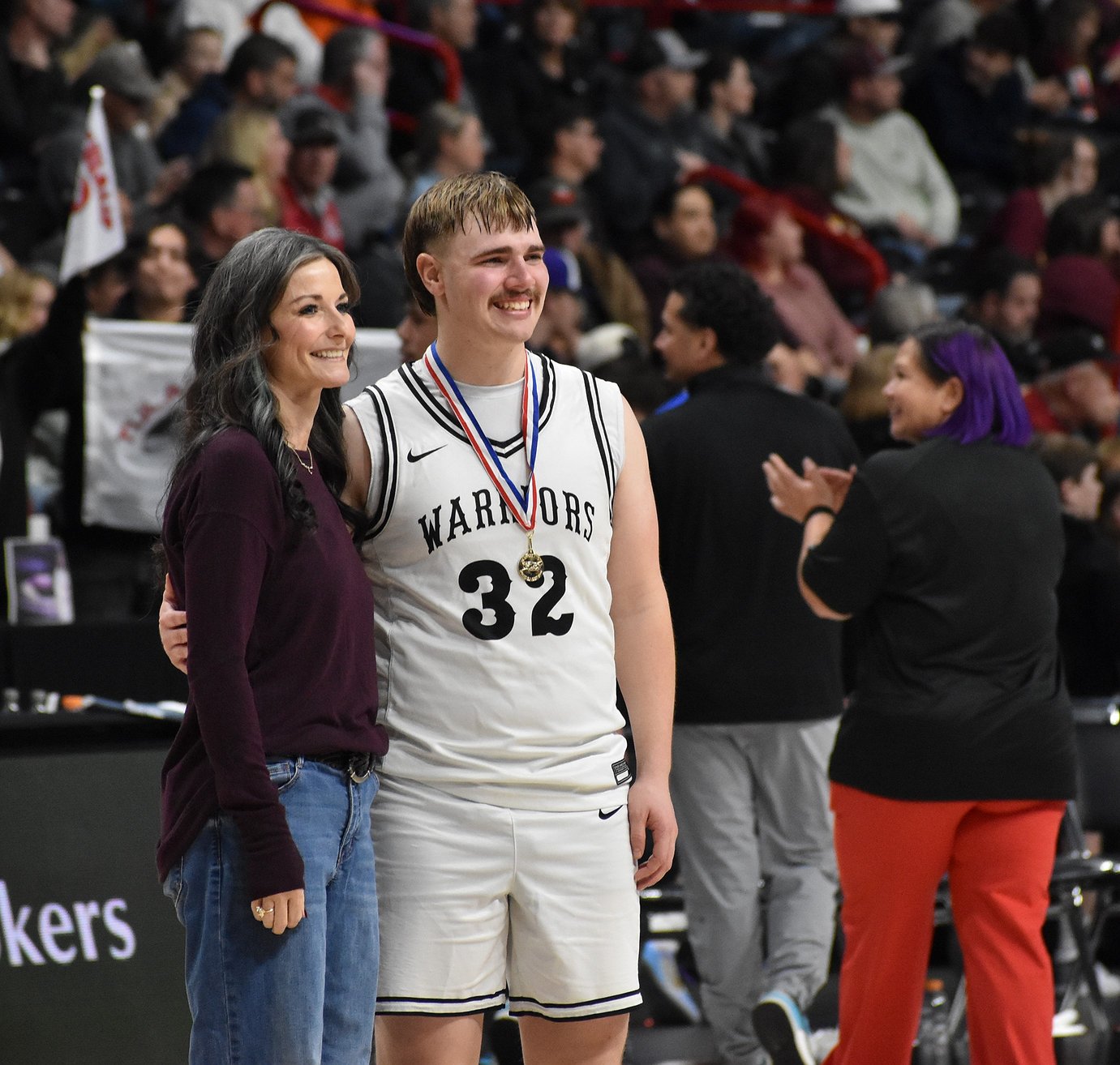 Warriors senior Caden Correia takes a photo with ACH Principal Kelley Boyd after being presented the sportsmanship award following Friday’s game against Tulalip. Correia said he will look back fondly on all the memories he made as a basketball player for the Warriors.
