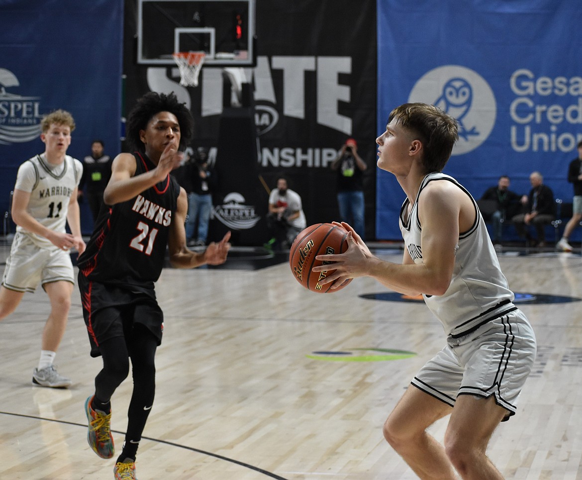 Josh Booker, a senior from ACH, prepares to sink a three with pressure approaching from a Tulalip Hawks player during the state semifinals. Booker is one of the four seniors who will be graduating from the team in the