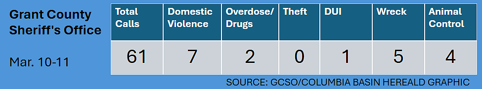 The reports below were provided by the Grant County Sheriff's Office. All suspects are considered innocent until proven guilty in a court of law. NL in an entry indicates no location listed for the incident.