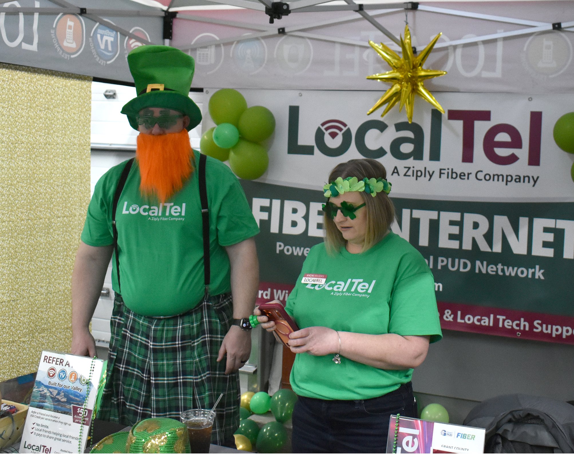 Most of the exhibitors paid some homage to the themes. Vicki Rivers and Spencer King at LocalTel had matching green shirts, and King had a leprechaun hat, a bright orange beard and a green plaid kilt as well. Bud Clary Auto Group brought in vehicles, all of which were either red, white or blue. They also had a foam rubber basketball and a small hoop and gave prizes to anyone who could sink a shot.