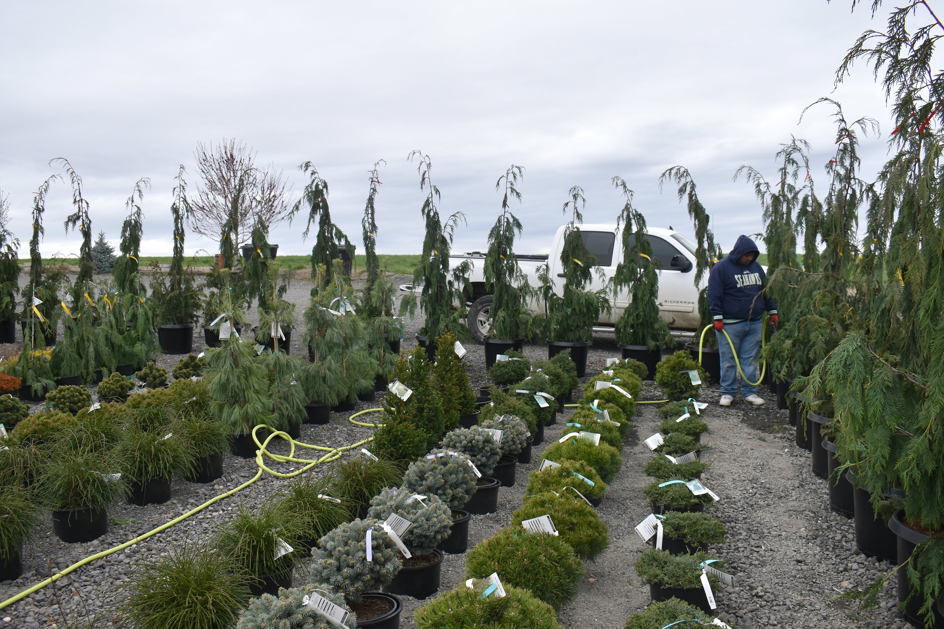 The expanded tree section was all flat ground Tuesday, with pots laid out in rows awaiting the new conifers. Most of the trees Seed Cupboard carries are ornamental, although they do have some small fruit trees as well.