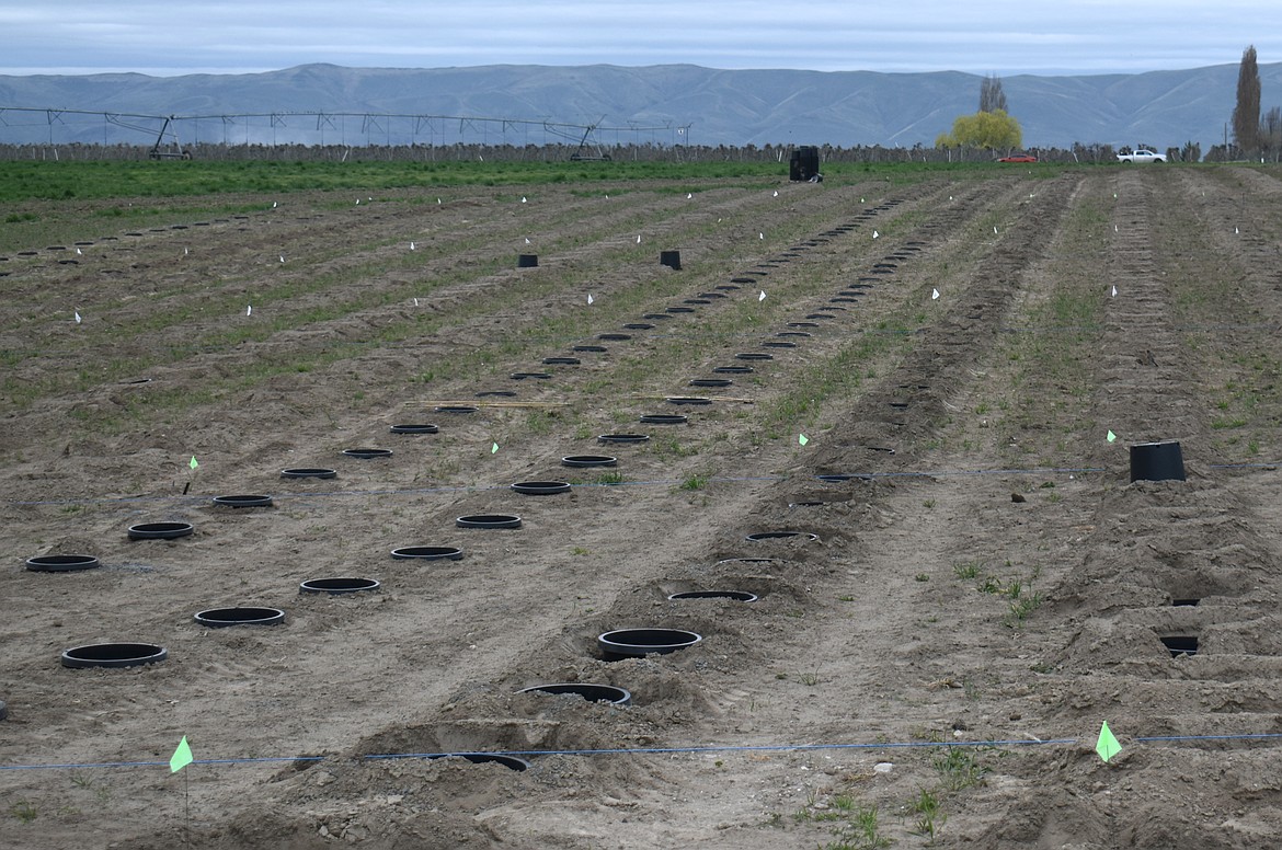 The expanded tree section was all flat ground Tuesday, with pots laid out in rows awaiting the new conifers. Most of the trees Seed Cupboard carries are ornamental, although they do have some small fruit trees as well.