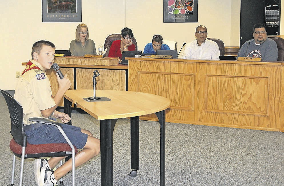 Jacob Risenmay explains his proposed Eagle Scout project to the Othello School Board at its Monday meeting.