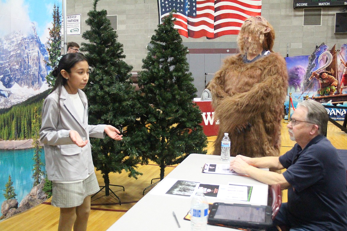 With Bigfoot watching, Elisa Balenos, Othello, has to argue for or against Bigfoot’s existence during the Amazing Shake in Mattawa Tuesday.