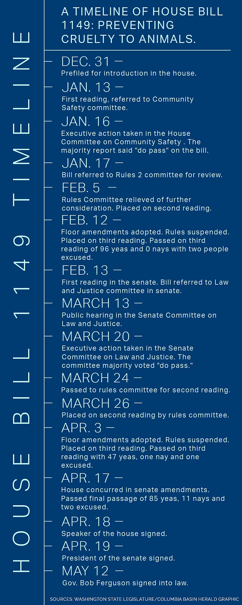 OLYMPIA — In a step toward enhancing animal welfare, the Washington State Legislature has passed House Bill 1149, an act aimed at the prevention of cruelty to animals. The bill received overwhelming support, with a vote of 96-0 in the House and 47-1 in the Senate, before being concurred by the House at 85-11. Gov. Bob Ferguson signed the bill into law Monday. “We will always be in favor and supportive of legislation that ends the suffering of animals and holds people accountable when they do cause unnecessary means of suffering to an animal,” Grant County Animal Outreach President Sara Thompson Tweedy said. “We’re always going to be in favor of legislation that enables law enforcement to do their job effectively and efficiently to end that suffering.”