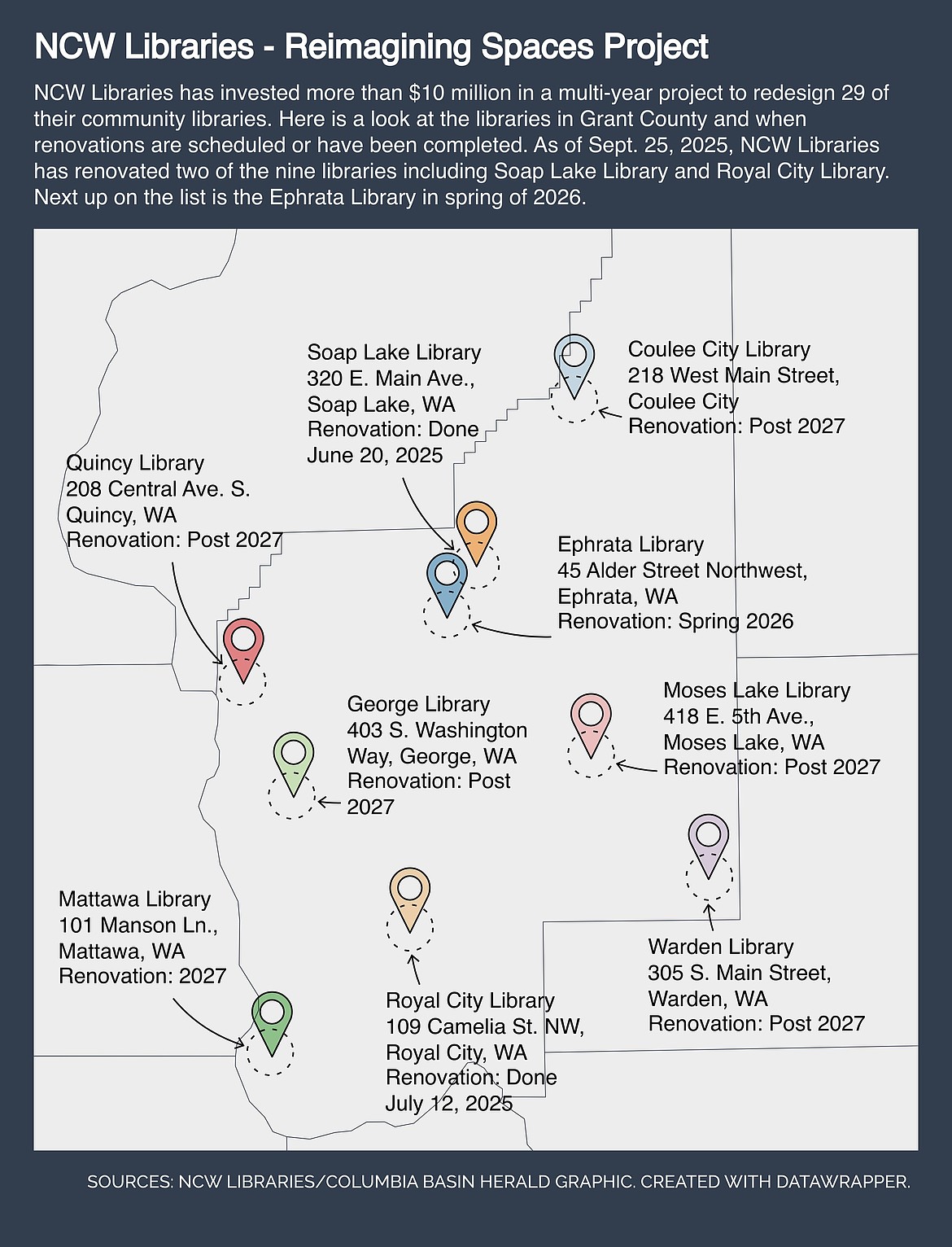 EPHRATA – The North Central Washington Library District is making strides towards the remodeling of several public library facilities across the region, but delays in the Ephrata Library renovations have raised questions about the timeline of future projects. The project, according to Supervising Librarian Aaron Loeffelbein, was supposed to start at the beginning of 2026. However, the district is now expecting a start date closer to March or April of 2026.