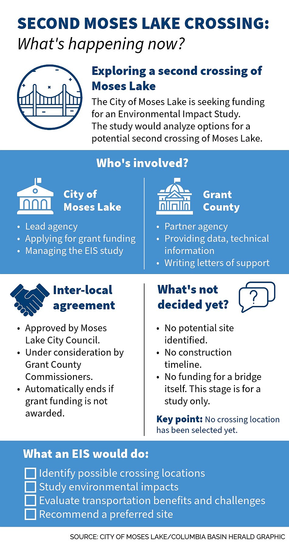 MOSES LAKE — The city of Moses Lake will take the lead in obtaining funding for an environmental impact study of a possible second crossing of Moses Lake. Moses Lake City Council members approved an interlocal agreement with Grant County April 14, and it’s scheduled for a vote of the Grant County Commissioners Tuesday. Moses Lake City Manager Rob Karlinsey told council members it’s a first step toward fulfilling one of the council’s top goals, which is to at least start studying the possibility of a second lake crossing. “We have applied for federal funding to help us study that. For us to receive that funding, we need to have an interlocal agreement with the county, because the likely locations of that lake crossing are going to be in (the) unincorporated county,” Karlinsey said.
