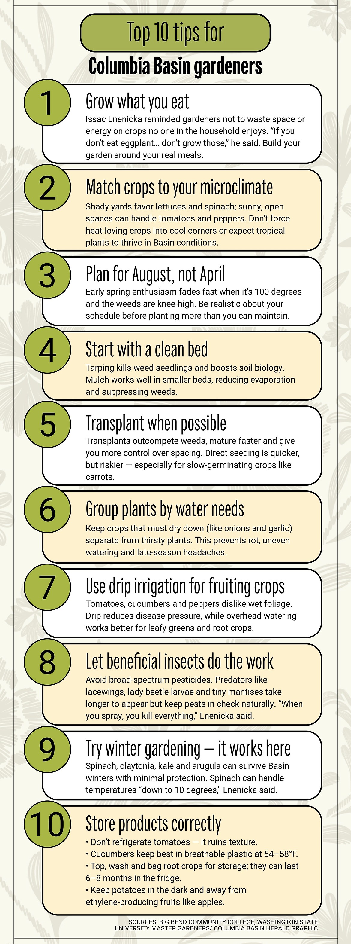 MOSES LAKE — Home gardeners packed the ATEC building at Big Bend Community College on Saturday for a Master Gardeners eco‑gardening workshop that blended science, soil care and hands‑on pest management — all tailored to the Columbia Basin’s unique growing conditions. Start with your real life, not your Pinterest board Soap Lake farmer and certified arborist Issac Lnenicka opened the day by urging gardeners to begin with honest self‑assessment: what they eat, how much time they have and what their yards can realistically support.