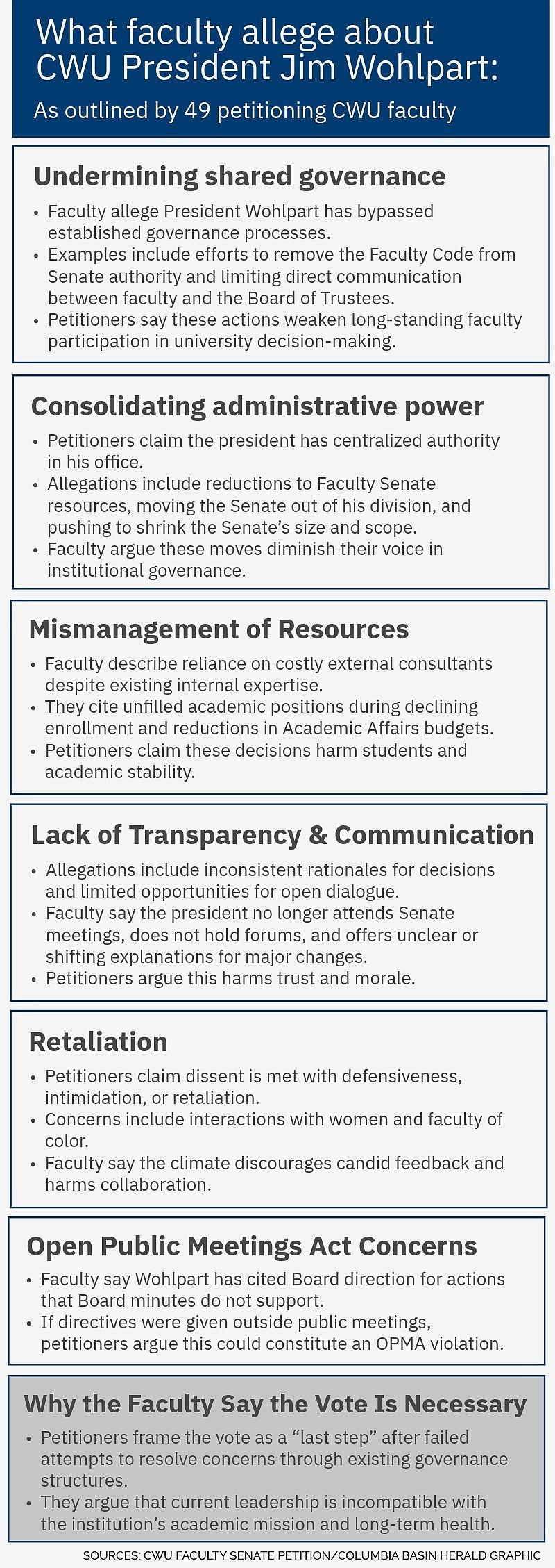 ELLENSBURG — A group of 49 Central Washington University faculty members is disputing part of the university’s public statements regarding the ongoing vote of no confidence in President Jim Wohlpart, saying the campuswide ballot is already in progress and not pending, as an earlier university email suggested.