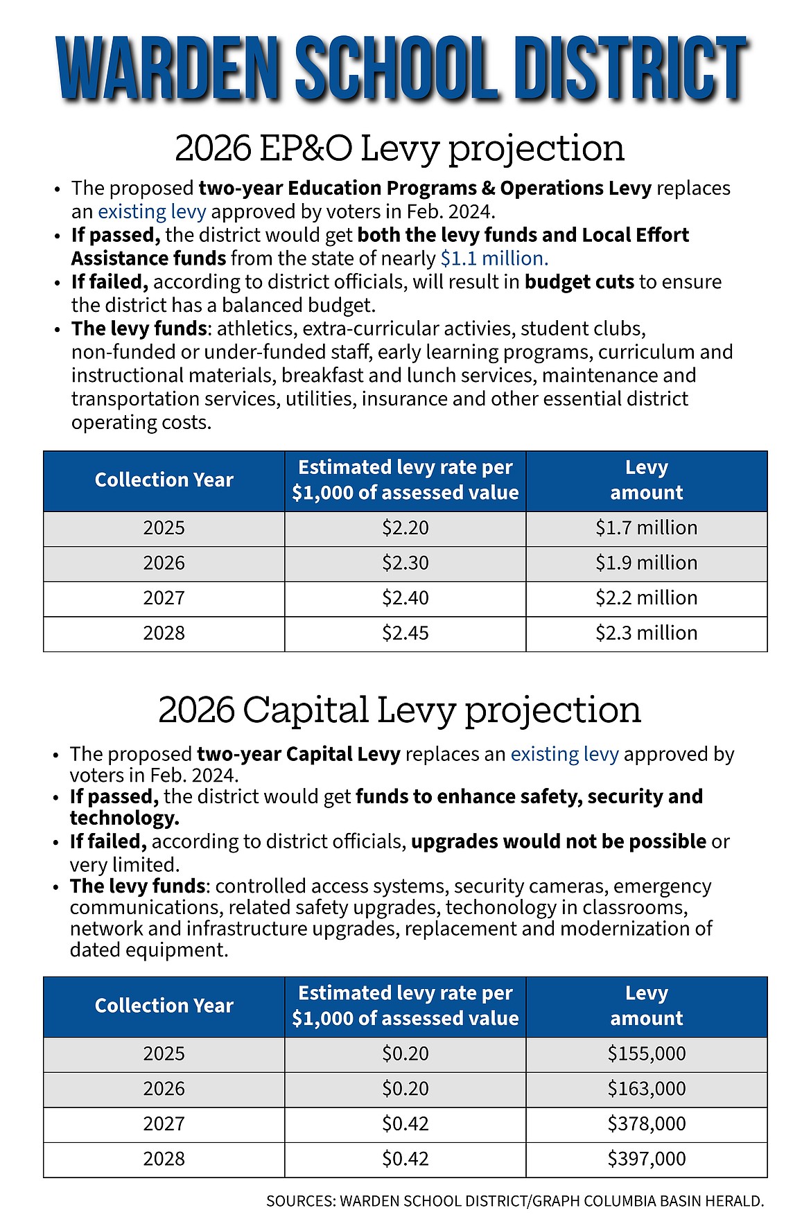 WARDEN — The Warden School District has proposed two levies to the community for the Feb. 10 election. The Educational Programs and Operations Levy and the Capital Levy for safety, security and instructional technology improvements are both designed to support the district's ongoing operational needs and infrastructure improvements. Superintendent Marc Brouillet said both levies are important in maintaining educational standards and student safety. "Without this funding, we would be unable to maintain the quality of education that our students deserve," Brouillet said. "We rely heavily on these local funds to supplement what the state provides." The two levies are estimated to cost taxpayers a total of $2.82 per $1,000 of assessed property value. Both levies are set for a two-year term and are replacements of previous levies passed by voters.