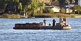 The pyrotechnics team sets up for the fireworks show on a boat in the middle …