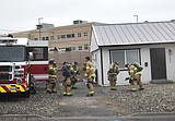 Firefighters compare notes after putting out a simulated fire at a house in Moses Lake. …